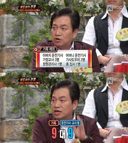 배우임영규는 연예인이 되기전부터 엄청난 부잣집에서 태어난 것으로 유명했는데요. 방송에서 가족 제외하고 일하는 직원이 9명이라고 밝히기도 했어요. 아버지 운전기사, 어머니 운전기사, 가정교사 3명, 가사도우미 2명, 정원관리사 1명, 집사 1명이 있을 정도면 어느 정도 재력이었는지 상당하네요.