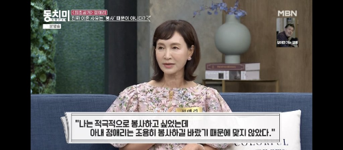 정애리는 방송에 출연해 이혼 이유에 대해 최초로 털어 놓기도 했는데요. 개인사라 방송에서 공개하기가 조심스러웠는데 전남편이 이혼 사유가 봉사때문이었다고 한 인터뷰를 보고 해명해야 할 것 같았다고 전했어요.