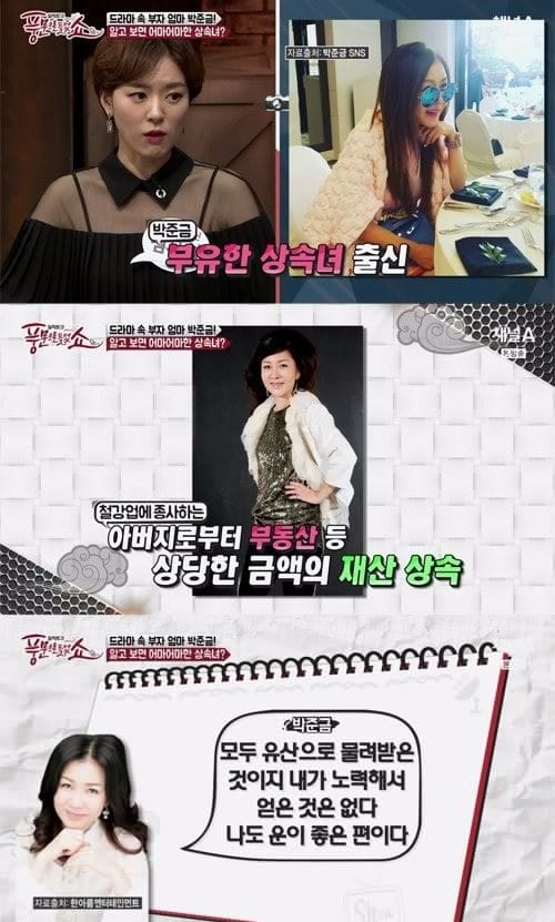 드라마 속에서 항상 부자 엄마로 나오는데 실제로도 아버지로부터 유산을 물려 받았는데 춘천의 상가 건물, 압구정 현대 아파트, 서울 성수동 고급아파트, 안산의 대부도 땅 등 받았는데 이것도 세 딸에게 똑같이 유산을 물려줘서 이 정도 라고 해요.