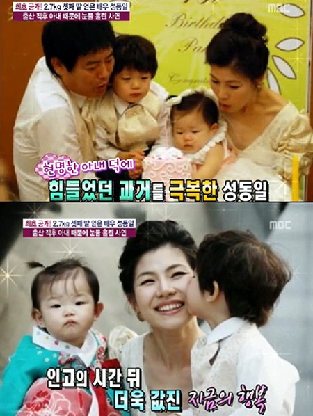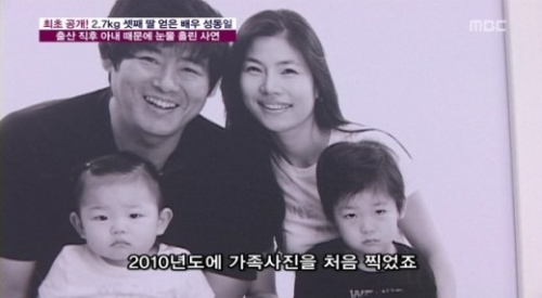 자신의 인생작은 아내를 만나 것이라고 밝혔는데요. 2003년 아내와 결혼했으며, 2006년 장남 성준, 2008년 장녀 성빈 그리고 2011년에 막내 성율이 태어났습니다. 예능 <아빠!어디가>에서 아이들과 함께 출연해 많은 사랑을 받았었습니다. 이 프로 이전에는 아이들이 아빠를 무서워했는데, 이후에는 성동일의 자식교육관이 많이 바뀌어 아이들과 관계 좋아졌다고 합니다.