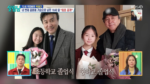 박영규는 4번째 결혼을 하면서 어린 딸이 생겼는데요. 방송 살림남에서 최초로 딸을 공개했습니다. 초등학교 졸업식, 중학교 졸업식 참석하며 딸아이의 성장과정을 곁에서 지켜봐 주는 다정한 아빠의 모습을 보여주었어요.